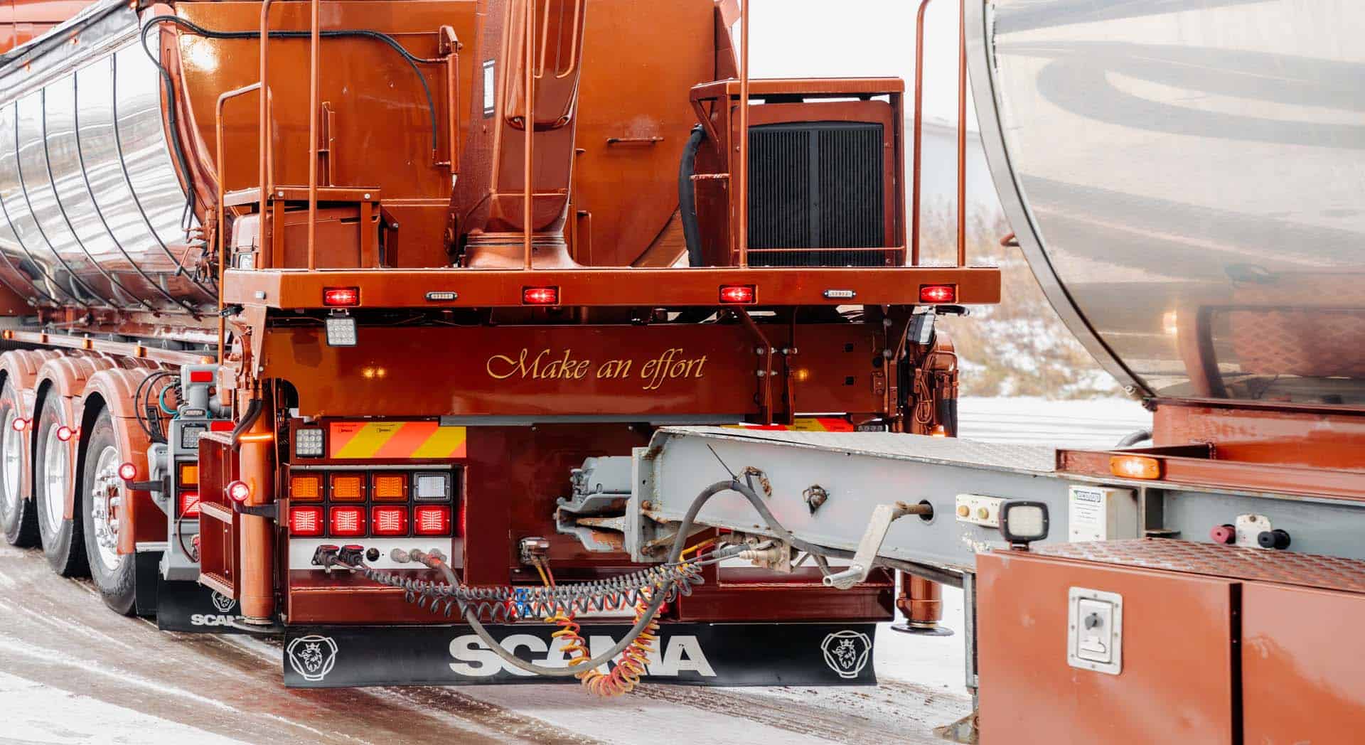 Vores tilgang til arbejdet som vognmand er simpel og kan ses på vores lastvogns kran, hvor der står ”make an effort”. For os er umage og en ærlig indsats hver eneste gang nemlig ord, der dækker over hele vores måde at håndtere og løse dine opgaver på. Derfor har vi også stort fokus på altid at give dig: